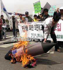 一些韓國示威者在韓國國防部門前焚燒美制武裝直升機(jī)模型,以抗議美國政府向韓國出售武器。他們認(rèn)為,美向韓出售武器將損害朝鮮半島的統(tǒng)一進(jìn)程!