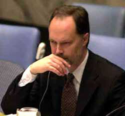 5月3日,聯(lián)合國(guó)經(jīng)濟(jì)及社會(huì)理事會(huì)舉行會(huì)議,對(duì)該理事會(huì)下屬各機(jī)構(gòu)的成員國(guó)進(jìn)行改選。美國(guó)在聯(lián)合國(guó)人權(quán)委員會(huì)的改選中落選。圖為美國(guó)駐聯(lián)合國(guó)代理大使詹姆斯·坎寧安在當(dāng)天聯(lián)合國(guó)安理會(huì)的會(huì)議上面無(wú)表情地聽(tīng)著別人的發(fā)言。 |