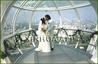 在英國著名的“倫敦眼”新千年觀光摩天輪上,31歲的斯特普爾頓和他26歲的新娘在距地面450英尺(約137米)的高空深情地擁吻。這對新人來自西薩塞克斯郡,他們因在一家電視臺早晨節(jié)目的一項比賽中獲勝而成為首對在“倫敦眼”上舉行婚禮的夫婦!
