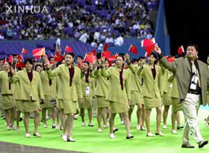 東亞運動會開幕式上中國代表團走入會場 5月19日,第三屆東亞運動會在日本大阪開幕。來自10個國家和地區(qū)的近3000名運動員將在15個大項201個小項和2個表演項目中展開角逐。 圖為中國代表團第一個走入會