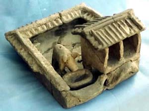 這是漢墓中出土的陪葬品—陶廁所豬圈。