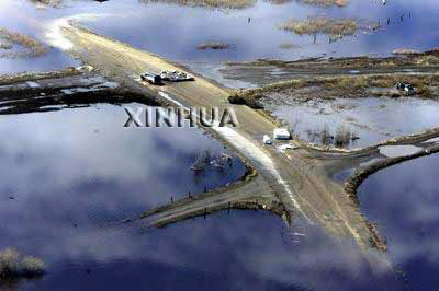 俄羅斯雅庫(kù)茨克市勒拿河近日的融冰造成了東西伯利亞一個(gè)世紀(jì)來(lái)最大的水災(zāi),當(dāng)?shù)貛浊用癖黄入x開(kāi)家園。圖為被洪水淹沒(méi)的道路鳥(niǎo)瞰。