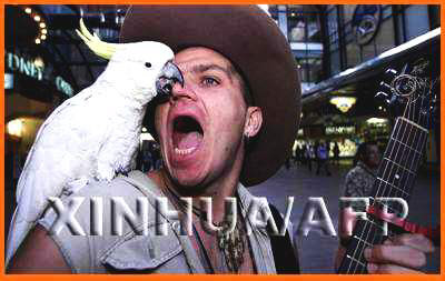 40歲的街頭藝人“鸚鵡保羅”在悉尼街頭向人們表演時(shí)被12歲大的鸚鵡“泡菜”咬住自己的鼻子。澳大利亞目前的失業(yè)率已達(dá)6.8%。街道劇院允許保羅和“泡菜”在不領(lǐng)取失業(yè)救濟(jì)金的情況下,自謀