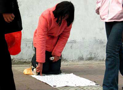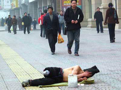 老趙很自豪地告訴記者,他討錢的經歷有兩年多了,經常四處游蕩,在北京日收入200多一點,但現在人太多了,而且影響首都的形象,呆不長,警察抓的很厲害。到西安要錢最多的是去年十月的黃金周,在大雁塔一帶,每日最高能要到150。