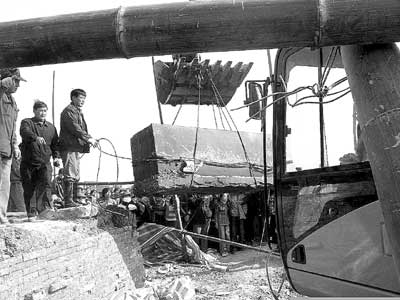 昨天中午,起重機將棺槨吊出墓室的舉動引得圍觀者數(shù)次沖開護欄進入工作地帶。下午2時20分,棺槨被裝上一輛藍色大卡車,在警察護送下,3時40分運抵南京市博物館!