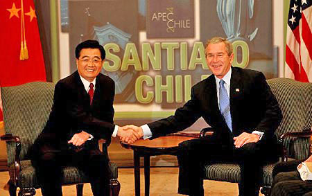 資料圖片:2004年11月20日,中國國家主席胡錦濤在智利首都圣地亞哥市出席亞太經(jīng)合組織領導人非正式會議期間會見美國總統(tǒng)布什。新華社記者 樊如鈞攝