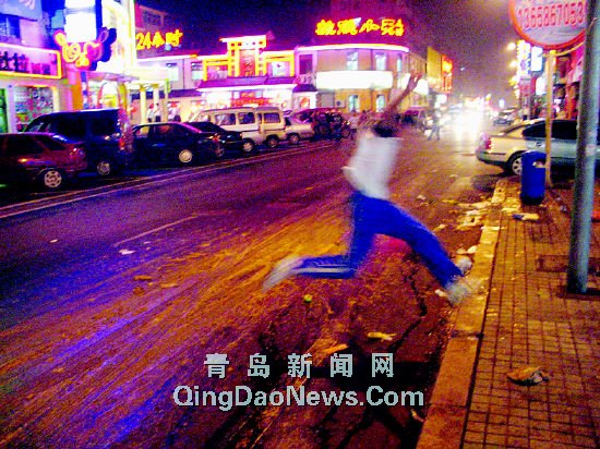 昨晚,臺(tái)東八路一路段灑上一大片泔水,造成路面嚴(yán)重濕滑,使8輛摩托車接連摔倒。