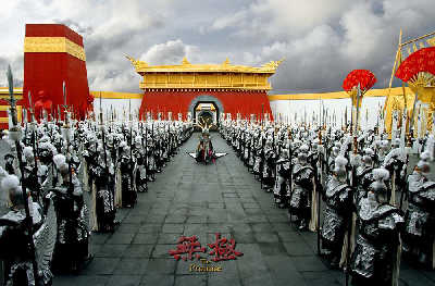 作為一部商業(yè)大片,《無極》的場面無可厚非是中國電影迄今為止最華麗的。藍(lán)天白云,紅黑軍團(tuán),還有飄揚(yáng)的粉色海棠花瓣,《無極》營造的是一個幻化了的世界。陳凱歌應(yīng)該對將如此三維游戲中才有的絢麗搬上大銀幕,得意并且熱衷。于是,他用大半的篇幅安排戰(zhàn)爭場面,還有許多看起來需要炫耀技巧的橋段。雖然篇幅有時略有些冗長,但這些學(xué)習(xí)好萊塢大片模式的視聽享受,對于電影票房有著極度的號召力。