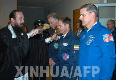 9月30日,在哈薩克斯坦的拜科努爾發(fā)射場,一位牧師向美國富翁奧爾森、俄羅斯宇航員托卡列夫和美國宇航員麥克阿瑟賜福。俄羅斯國家委員會30日在拜科努爾發(fā)射