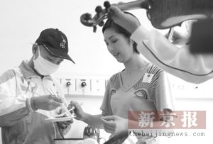 昨天下午,“小天使基金會(huì)”愛心大使楊千嬅帶著自己烤制的“北京烤鴨”,看望白血病患兒海棟。本報(bào)記者 倪華初 攝