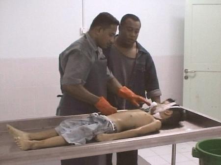 兩名醫(yī)務(wù)工作者檢查一名印尼旅游勝地巴厘島爆炸遇難者的情況。