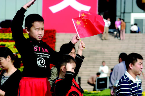 共有上萬(wàn)名市民參加了升國(guó)旗儀式。    8時(shí)30分,21名國(guó)旗護(hù)衛(wèi)隊(duì)隊(duì)員護(hù)送著國(guó)旗走到旗桿下,伴隨著雄壯激昂的《義勇軍進(jìn)行曲》,鮮艷的五星紅旗從升旗手手中揚(yáng)到空中,冉冉升起。記者于小陽(yáng)攝     |