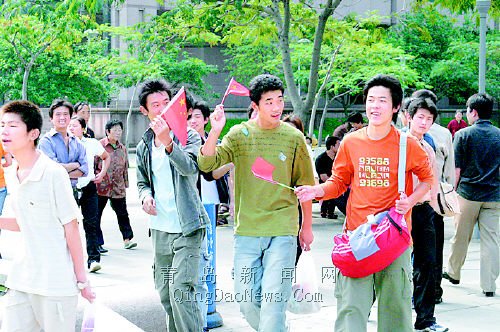 昨天,一群手持國(guó)旗的學(xué)生在五四廣場(chǎng)游覽。王群攝