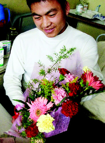 陳國英依然很堅強(qiáng),雖然傷口很疼,她已經(jīng)漸漸習(xí)慣了醫(yī)院的生活。直到昨天下午,當(dāng)來自德州的打工青年李永手捧著鮮花出現(xiàn)在病房時,陳國英平靜的臉上露出了些許害羞的表情———對這位21歲的姑娘來說,這是她這輩子收到的第一束鮮花。