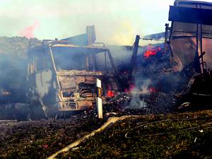 由于兩貨車剮蹭時油管破損,兩車的油箱相繼起火,并迅速引燃了混在一起的煤塊和電石,黑色的濃煙和火苗一下子冒了起來。