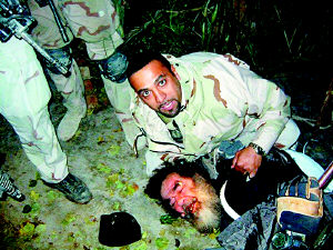 2004年1月,一張從美國軍事網(wǎng)站上流傳出來的照片通過互聯(lián)網(wǎng)迅速傳遍了全世界。照片上伊拉克前總統(tǒng)薩達姆·侯賽因被五花大綁反倒在地上,嘴角掛著鮮血,滿臉的驚恐。在他身邊圍著一群美軍特種部隊士兵,其中一人蹲在薩達姆身后,兩眼直勾勾地盯著相機鏡頭。得意的表情暴露出,他內(nèi)心中充滿的不僅僅是成功完成任務(wù)后的狂喜。