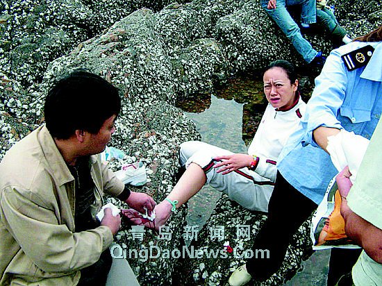 昨天,山西一女游客被海蠣子皮刺破腳部,鮮血直流。        王哲欒紹綱攝