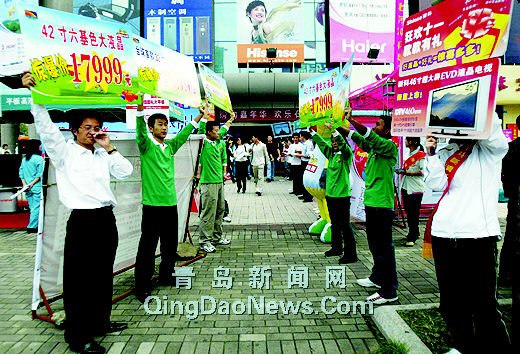 昨天一大早,國美、蘇寧等家電賣場,門口就搭起了促銷展臺,促銷人員邊演示其促銷的最新產品邊與顧客展開了互動有獎問答。賣場內,用玩具小熊、米老鼠、彩色氣球裝扮的店堂格外有過節(jié)的氣氛,這對小小顧客和年輕女顧客倒是很有吸引力。