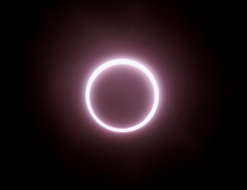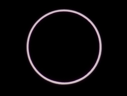這是10月3日西班牙首都馬德里拍攝到的日環(huán)食現(xiàn)象,由于月球視半徑小于太陽視半徑,因此月亮只遮擋住日面中心部分并在其周圍留下一個美麗的光環(huán)。當(dāng)天,在西南歐