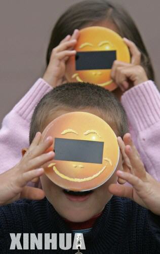 10月3日,兩名兒童在法國科西嘉島的巴斯蒂亞使用特制的太陽鏡觀看日環(huán)食。當(dāng)天,在西南歐和北非的部分地區(qū)均可以觀看到日環(huán)食這一天象奇觀。新華社發(fā)