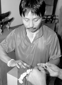 但昨日最吸引觀者眼球的當屬趙門傳人王正安獻上的兩手絕活:“鎖喉鋼槍挑千斤”和“鐵指神功”。據(jù)了解,“鎖喉鋼槍挑千斤”還是首次在公開場合亮相。