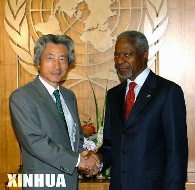 9月15日,聯(lián)合國秘書長安南(右)在美國紐約聯(lián)合國總部會見出席聯(lián)合國首腦會議的日本首相小泉純一郎。當(dāng)天,日本外務(wù)省新聞秘書香取良則在這里