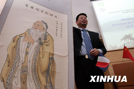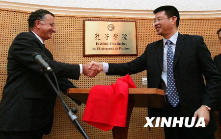 10月3日,法國普瓦捷大學(xué)校長讓·皮埃爾·蓋松(左)與中國南昌大學(xué)校長周文斌等共同為該校的“孔子學(xué)院”揭牌。當(dāng)日,由中國南昌大學(xué)、法國普瓦捷大學(xué)以及中國中興發(fā)展有限公司共同籌建的“孔子學(xué)院”在法國普瓦捷市正式掛牌。這家學(xué)院也是中國繼德國之后在歐洲建立的第二所“孔子學(xué)院”,其主要任務(wù)是教授漢語、傳播中國文化,讓更多歐洲人進(jìn)一步了解中國和中國文化。新華社記者宋立東