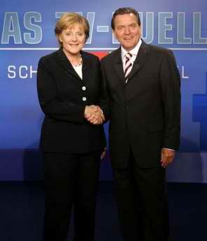 2005年9月24日,德國(guó)總理施羅德及保守派的挑戰(zhàn)者安吉拉·默克爾在柏林一家電視臺(tái)錄制間前合影。