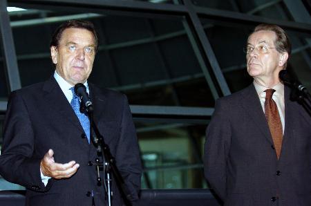 10月5日,在德國(guó)首都柏林,德國(guó)總理施羅德(左)和社民黨主席明特費(fèi)林與媒體見面!