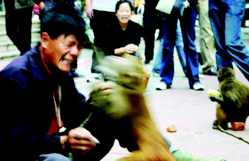 后一個(gè)節(jié)目是大猴子表演的“空中接刀”,由于大猴子速度太慢,影響了節(jié)目質(zhì)量,耍猴人便用刀把沖著猴的肚子刺去,被大猴機(jī)靈地躲過,這時(shí)大猴子憤怒了,帶領(lǐng)著另外兩只猴子一齊反抗,并不時(shí)拿起地上的磚頭砸向主人,另一只猴子則飛起抓住主人的頭發(fā)用力扯拉,疼得耍猴人滿臉通紅,連連求饒。據(jù)《今晨6點(diǎn)》     |