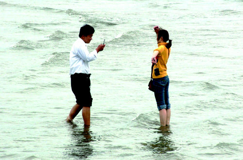 難舍島城美景,游人在海中用手機拍照留念 |