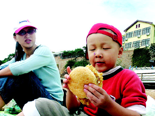 眼見東東開吃,大家也就不客氣了,酸奶、水果、火腿腸全都擺到餐布上!按蠛D茏寖鹤酉嘛。”陳敏向記者透露了“野餐之旅”的小秘密:兒子喜歡大海,每次到海邊聚餐,他都比平時能吃,這樣的“旅行”自然就會頻繁舉行。果然,一個漢堡包下肚后,東東還嫌不過癮,很快喝下一小瓶酸奶。小家伙挺著圓鼓鼓的肚子又開始在沙灘上撒歡。