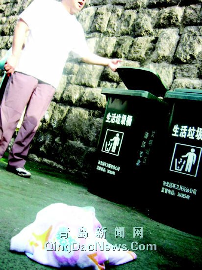 昨天上午8時(shí)許,記者接到讀者熱線后,立即趕至上海路47號(hào)。這里,已圍攏了二三十名市民。走過(guò)去,記者看到的第一場(chǎng)面是:在墻角有兩只藍(lán)色大垃圾桶,在這兩個(gè)垃圾桶旁邊的地面上,是一個(gè)卷起來(lái)的毛巾被,現(xiàn)場(chǎng)市民說(shuō),里面就是那個(gè)被發(fā)現(xiàn)的男嬰。