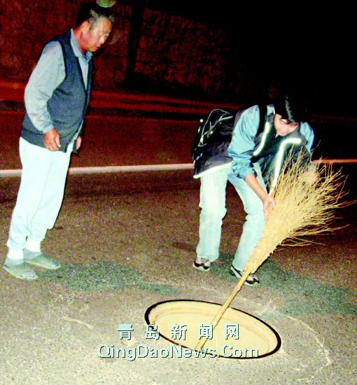 記者和老人一起,找到了一根長柄掃帚,擋在了無蓋古力井旁邊,以提醒車輛注意。 |