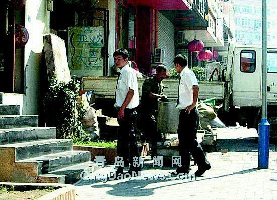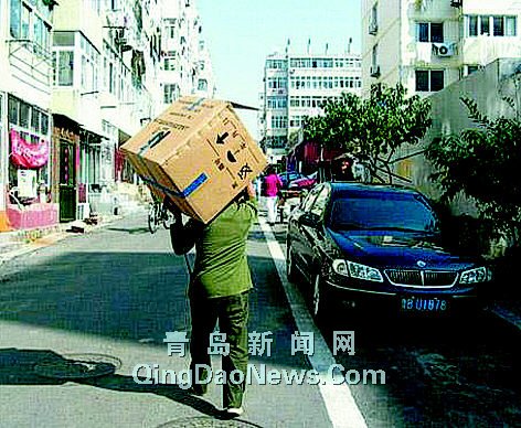 老漢將桶裝在紙箱后,并沒有馬上走,而是四處觀望(圖2),好像是在躲著人,在觀望幾分鐘后,他扛起紙箱,大搖大擺地穿過街頭(圖3)!拔耶敃r在后面緊緊地跟著,不知他到底要到什么地方,并邊走邊拍。拐了幾個路口,他將紙箱扛到了東昌路12號一個廢品收購站(圖4)!