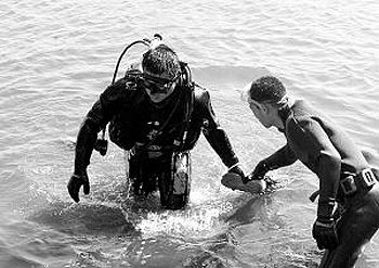 記者趕到工農(nóng)橋的時候,橋上及岸邊已經(jīng)站滿了圍觀群眾,兩名特勤二中隊的消防隊員正在緊急進(jìn)行著搜救,“水很涼,而且雜物很多,水下能見度很低!10分鐘后,一名隊員從水中出來,已經(jīng)被凍得臉色蒼白,雖然穿著厚厚的潛水衣,身體還是不停發(fā)抖,另一名隊員立刻跳入水中,就這樣,3名潛水員交替搜救著落水老人。