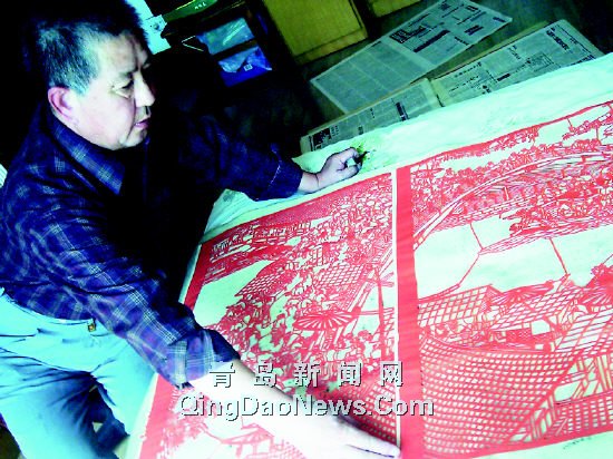 “十一”黃金周期間在膠南市舉辦的“山東省剪紙大賽”上,一幅17米長的剪紙《清明上河圖》獲得金獎。在長長的紙卷上,人物、街道、瓦屋安排得疏密有致;樓臺亭閣、小橋流水、市井人群處理得精致恰當(dāng)。在隨后的展出中,這幅剪紙成了觀眾矚目的焦點,引來贊嘆聲。昨天下午,記者趕到這幅剪紙的作者王順昌家中作了采訪。