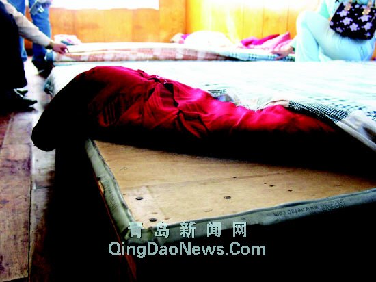 旁邊的休息室更是讓人無法接受。大房間里除了一張單人床,其余的五張簡(jiǎn)易床就擺在地上,木板上只鋪著一床薄褥,每張簡(jiǎn)易床都擺著六、七個(gè)小枕頭,“這是床嗎?”這里的簡(jiǎn)陋程度讓執(zhí)法人員連連搖頭。
