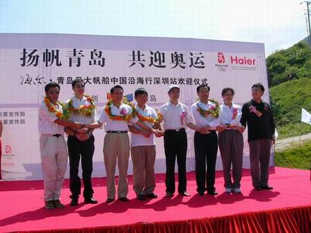圳站。歡迎儀式在深圳大亞灣的浪旗游艇俱樂部舉行。盡管大亞灣浪騎游艇俱樂部距離深圳市中心有近2小時的車程,但是還是有廣大的深圳市民一早來到了碼頭,迎接“海爾.青島號”大帆船的到港。另外青島一家駐深圳的企業(yè)廣東華美集團有限公司還組織員工一起來迎接家鄉(xiāng)的帆船。深圳市民們普遍對經(jīng)歷了四海兩江峽:渤海、黃海、東海、南中國海、黃浦江、珠江、臺灣海峽,全程2200多海里的“海爾.青島號”大帆船產(chǎn)生了極大的興趣,更有許多市民登上了帆船親身感受其中的樂趣。