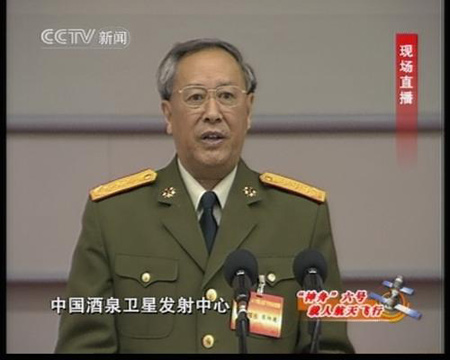 陳炳德:尊敬的胡總書記、溫總理,各位領導、各位來賓,同志們,根據(jù)航天城的測量結果,我現(xiàn)在鄭重宣布,神舟六號載人飛船發(fā)射取得圓滿成功。