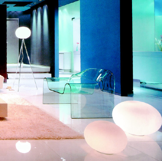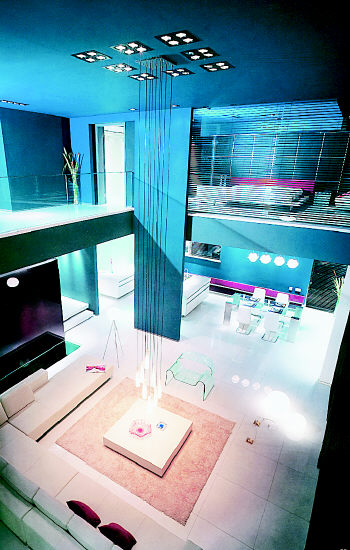 圖一:巨大的客廳,垂下的磨砂玻璃吊燈,照亮茶幾上部,強(qiáng)調(diào)出視覺焦點?臻g被不著印痕的巧妙分割、圍合。