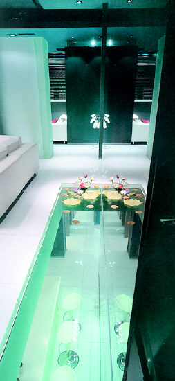 為解決地下層采光問題,設(shè)計師將一層紫色玻璃前方的地面打通并鑲嵌玻璃,成為地下層的天窗。玻璃上所飾的荷花、荷葉圖案在自然光的牽引下為地下層造出頂部盈盈一池清水的幻象。