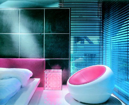 圖三:臥室局部,床頭柜是意大利的產(chǎn)品設(shè)計,內(nèi)置一盞燈,卻生出無數(shù)虛象。