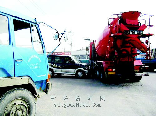 因視線被大卡車(chē)擋住,一輛 乘用車(chē)撞上剛拐過(guò)彎的攪拌車(chē)。