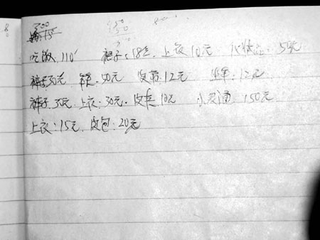 茍麗的遺物里有一份賬單,記著她被釋放后近一個(gè)月的花費(fèi)。陳小林說他去北京時(shí)沒給妻子留多少錢,估計(jì)這些都是她自己掙的。從賬單上看,她每天吃的沒有超過4元,惟一的奢侈品就是150元的小靈通了。衣服鞋子之類,則是她被釋后要買的必需品,但沒有一件超過50元。在陳小林的記憶里,妻子一生沒有穿過超出60元的衣服,“去年她懷孕時(shí)我給她買的棉衣是最貴的,60元。”