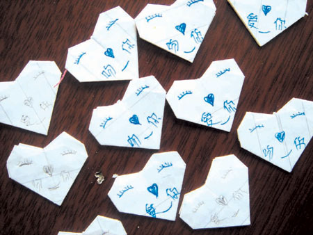 流傳在發(fā)廊周圍的一個(gè)說法。發(fā)廊的小姐們說,茍麗每和客人作一次性交易,就會(huì)默默地用紙折下許多顆心
