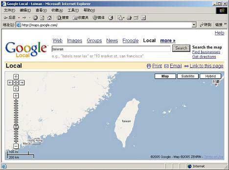 Google網(wǎng)站截圖:現(xiàn)在到網(wǎng)址上輸入Taiwan一字,出現(xiàn)的臺灣地圖之左上角已不見“臺灣,中國的一省”字句,變成可以移動地圖的上下左