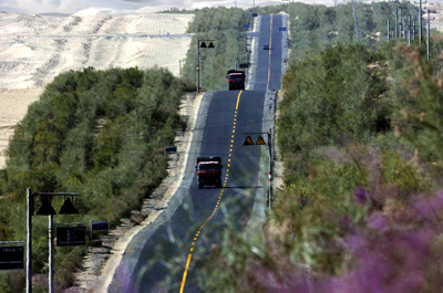 這是綠化帶掩映下的塔里木沙漠公路(資料照片)。