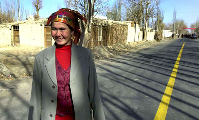 新疆民豐縣尼雅鄉(xiāng)卡帕克阿斯坎村的維吾爾族婦女古麗沙依甫汗站在自家門前新建的公路上說:“以前騎毛驢去一趟縣城需3――4天,現(xiàn)在乘車不到兩小時。太好了!”(2003年11月17日攝)國家投資880多萬元新建的這條沙漠公路全長17公里。它的建成通車?yán)怂死敻纱笊衬喜扛沟毓爬洗迩f與外部世界的距離。