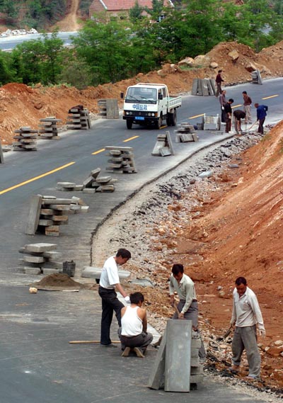 2005年5月19日,施工人員在豫西山區(qū)一條公路上進(jìn)行收尾工作。為加快農(nóng)村公路建設(shè),盡早實現(xiàn)全省城鄉(xiāng)一體化的交通,河南省2005年拿出60億元專項資金,用于農(nóng)村、特別是經(jīng)濟(jì)欠發(fā)達(dá)山區(qū)縣鄉(xiāng)的公路建設(shè)。